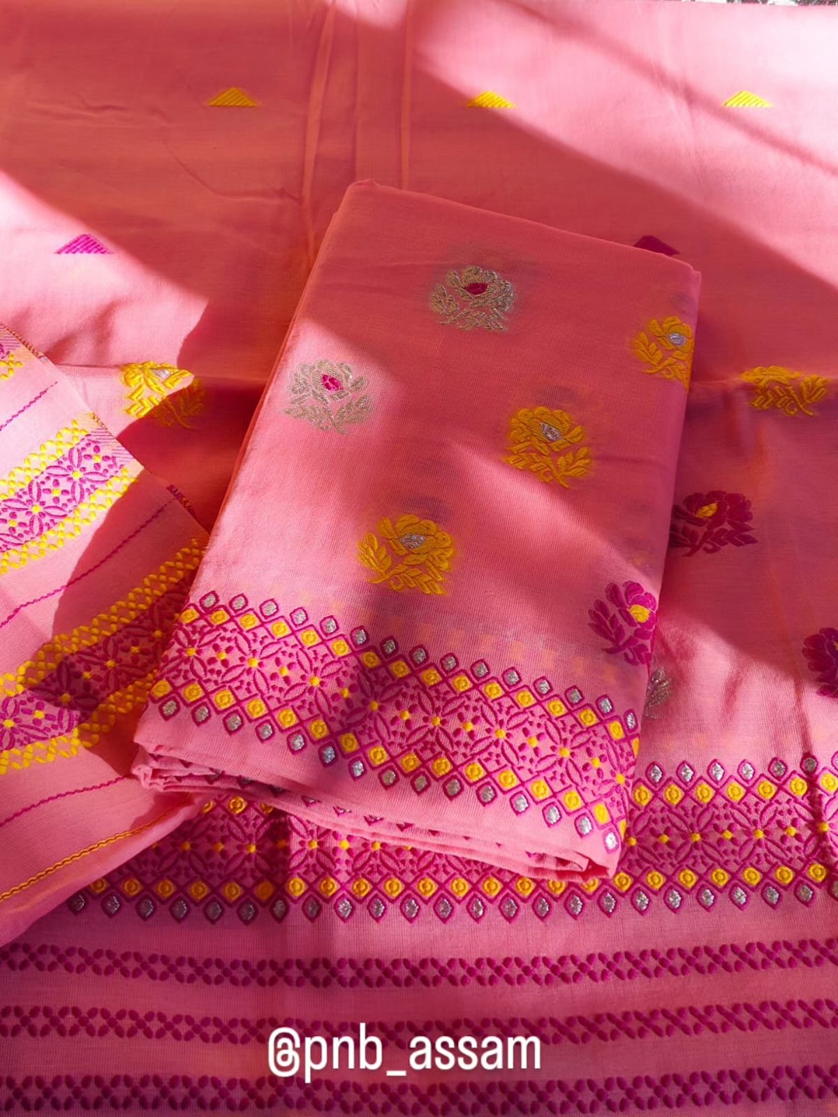 The borders and pallu are decorated with machine-woven floral and geometric patterns in a beautiful combination of magenta pink, golden yellow, and subtle silver detailing.